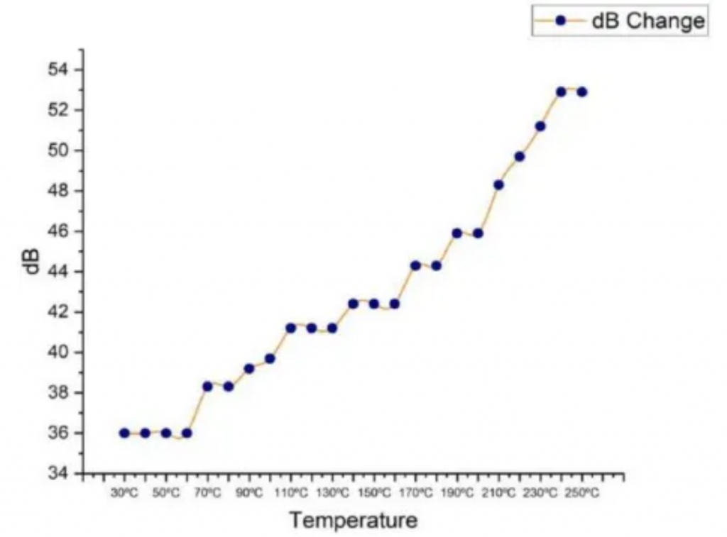 圖1是厚度25mm低碳鋼鋼板,隨著溫度升高,底波達到80%時的儀器增益(dB)值,可以看出,溫度在30℃~60℃之間時,dB值比較穩定,超過60℃后,dB值較快增加。