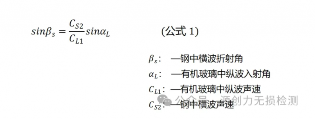 我們知道,鋼中橫波的產生機理為:探頭晶片發出縱波,經斜探頭的有機玻璃楔塊傾斜入射至有機玻璃—鋼界面時產生折射,進而獲得在鋼中斜入射的橫波S,鋼中的橫波折射角由折射定律(公式1)決定: