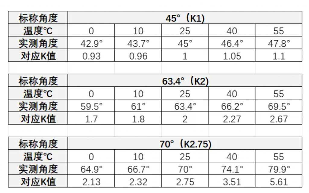 • 以工程檢測常用的K2探頭為例,室溫25℃下K值為2.0,環境溫度0℃時K值為1.7,環境溫度40℃時K值2.67;