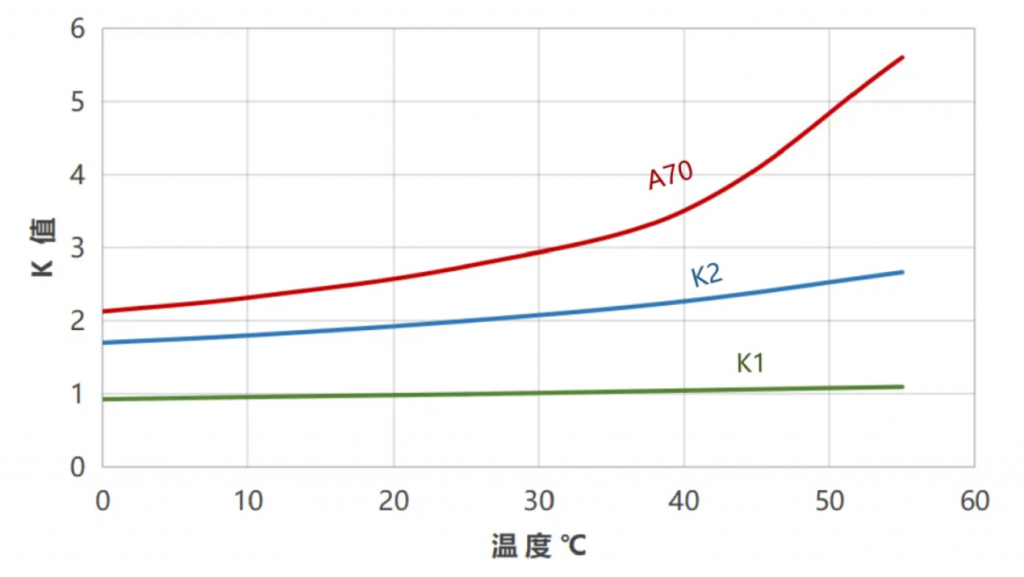 • 70°探頭隨溫度變化更大,25℃與40℃相比,K值相差接近30%;