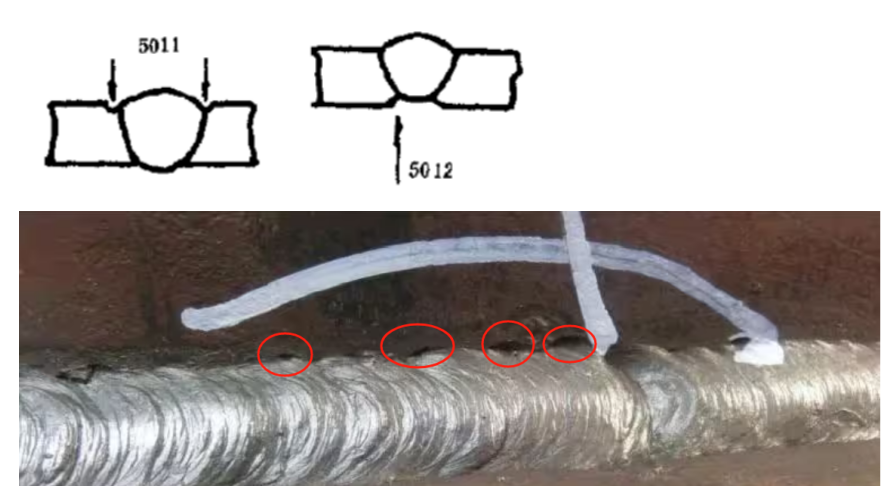 | 4 | 咬邊 | Figure4 | 不允許 | 深度:≤0.05t且≤0.5mm,長度:連續(xù)長度≤100mm,且焊縫兩側(cè)咬邊總長度≤10%焊縫全長 | 深度:≤0.1t且≤1mm,長度:不限 |