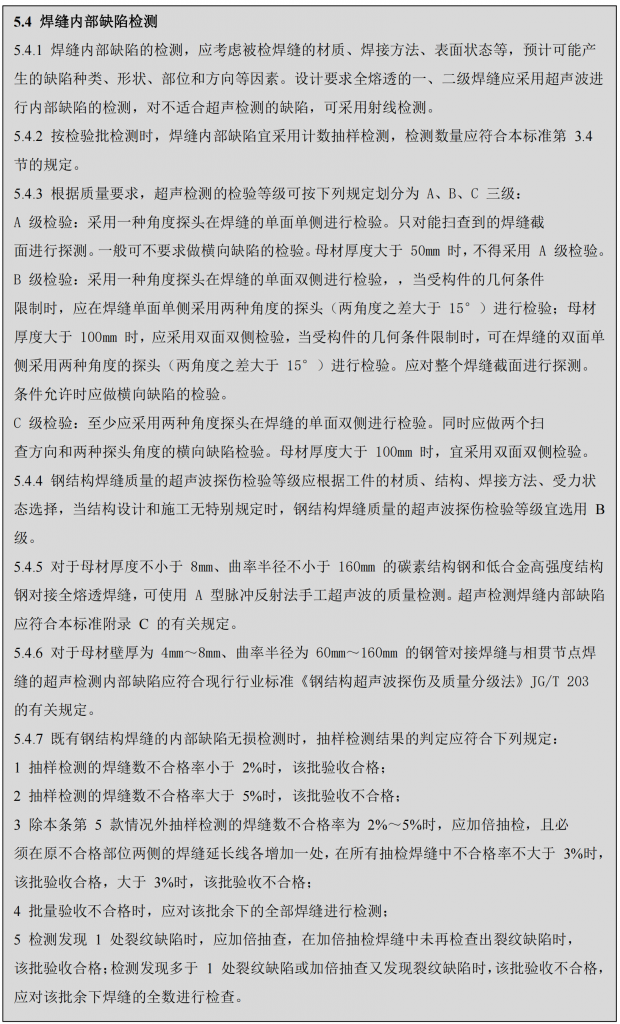 但是,在《鋼結(jié)構(gòu)設(shè)計(jì)標(biāo)準(zhǔn)》GB 50017-2017、《鋼結(jié)構(gòu)工程施工質(zhì)量驗(yàn)收標(biāo)準(zhǔn)》GB50205-2020、《鋼結(jié)構(gòu)焊接規(guī)范》GB 50661-2011 等標(biāo)準(zhǔn)中對于鋼結(jié)構(gòu)焊縫是按照焊縫質(zhì)量等級劃分的,沒有驗(yàn)收等級的概念,所以,在鋼結(jié)構(gòu)焊縫超聲檢測過程中存在檢測、驗(yàn)收、評定標(biāo)準(zhǔn)不協(xié)調(diào)的問題。